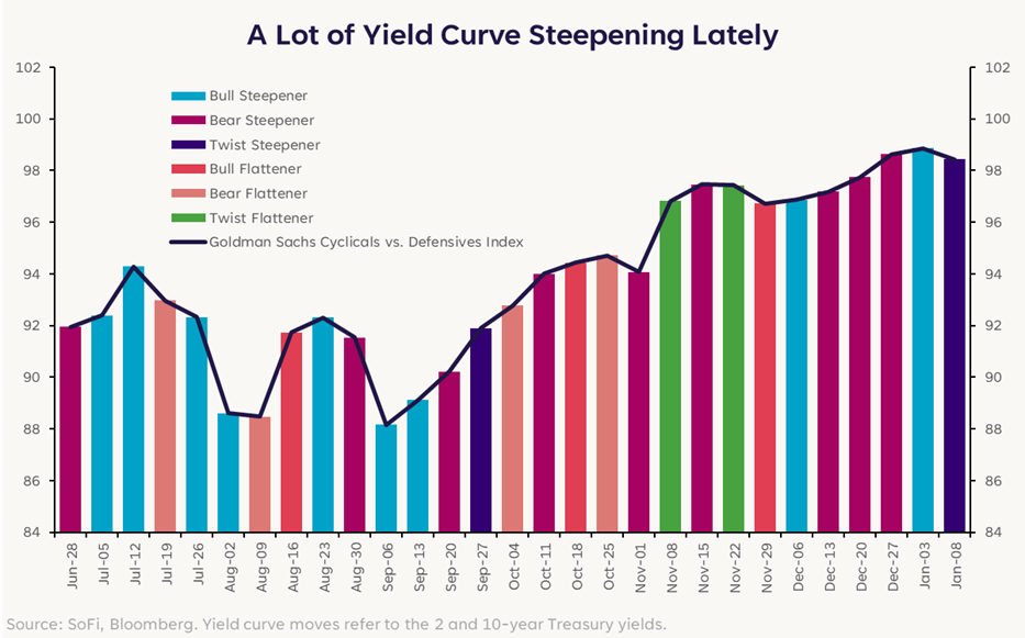 Regardless of whether these have been bull steepeners or bear steepeners (with the terms bull & bear referring to the bond market, not the equity market), the rise in 10-year yields has put some stress on equity markets. Over that same six week period, the S&P 500 is down roughly 2%.