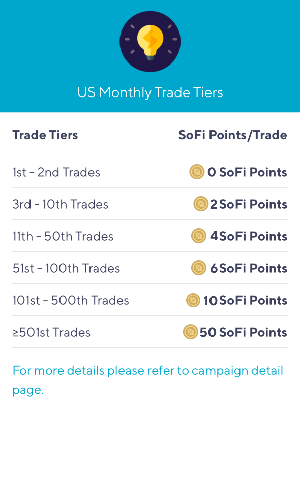 a. Earn SoFi Points based on the number of your US trades. The more trades you complete each month, the more SoFi Points you earn for each additional trade!