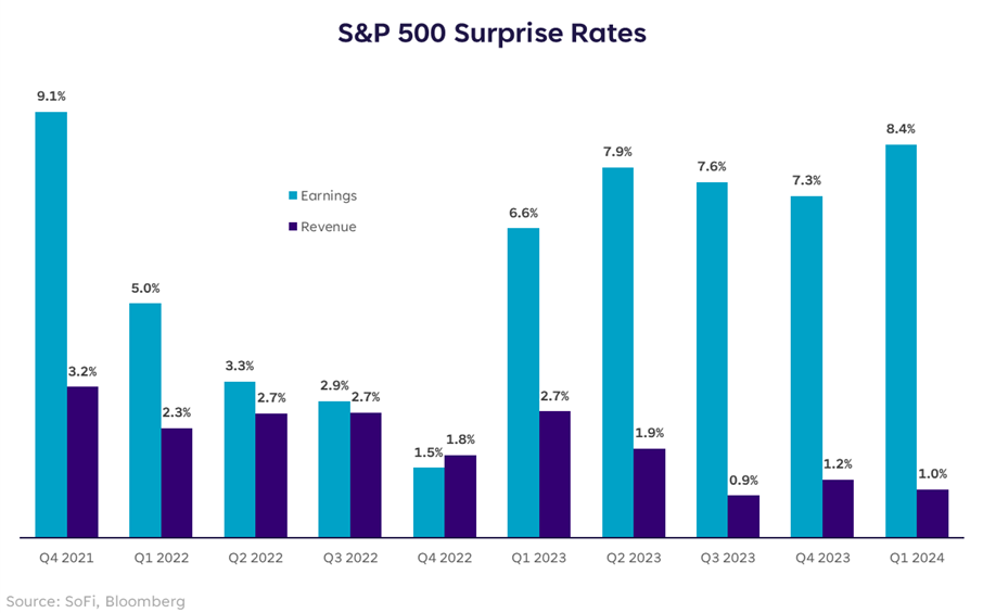 S&P 500 companies went through such a struggle a year ago – earnings growth was negative from the fourth quarter of 2022 until the second quarter of 2023 – but there were some positive signs underneath the surface. It was around that time that the earnings surprise rate increased dramatically, and it’s important to remember that markets are forward-looking and price in available information.