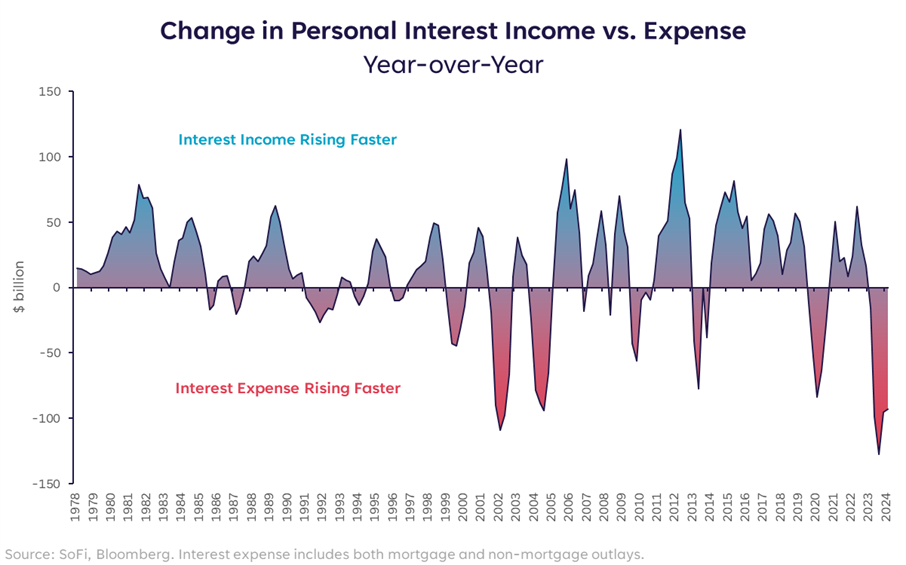 A recent debate that has surfaced is the idea of higher interest rates actually being stimulative for the economy, rather than the conventional theory of them restricting economic activity. Like many debates over macro and market drivers, this one isn’t cut-and-dry, but we dug deeper to try to suss out any evidence that high rates are helping consumers rather than hurting them.