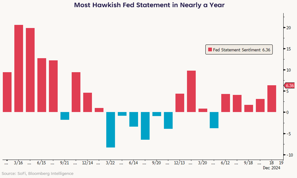 It wasn’t the rate cut that moved markets, it was the dot plot and the summary of economic projections, both of which came across hawkish. Combining those outputs with the commentary from Powell resulted in this Fed statement scoring as the most hawkish since January 2024.