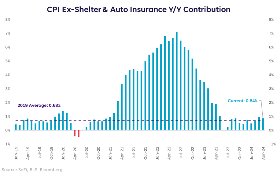 More good news: when we look at how much each component is contributing to overall inflation, on average, most items are back down to their pre-pandemic contribution levels (note: this is different from their absolute price levels, which are still elevated relative to pre-pandemic readings). The only two components still contributing much more are shelter and auto insurance.