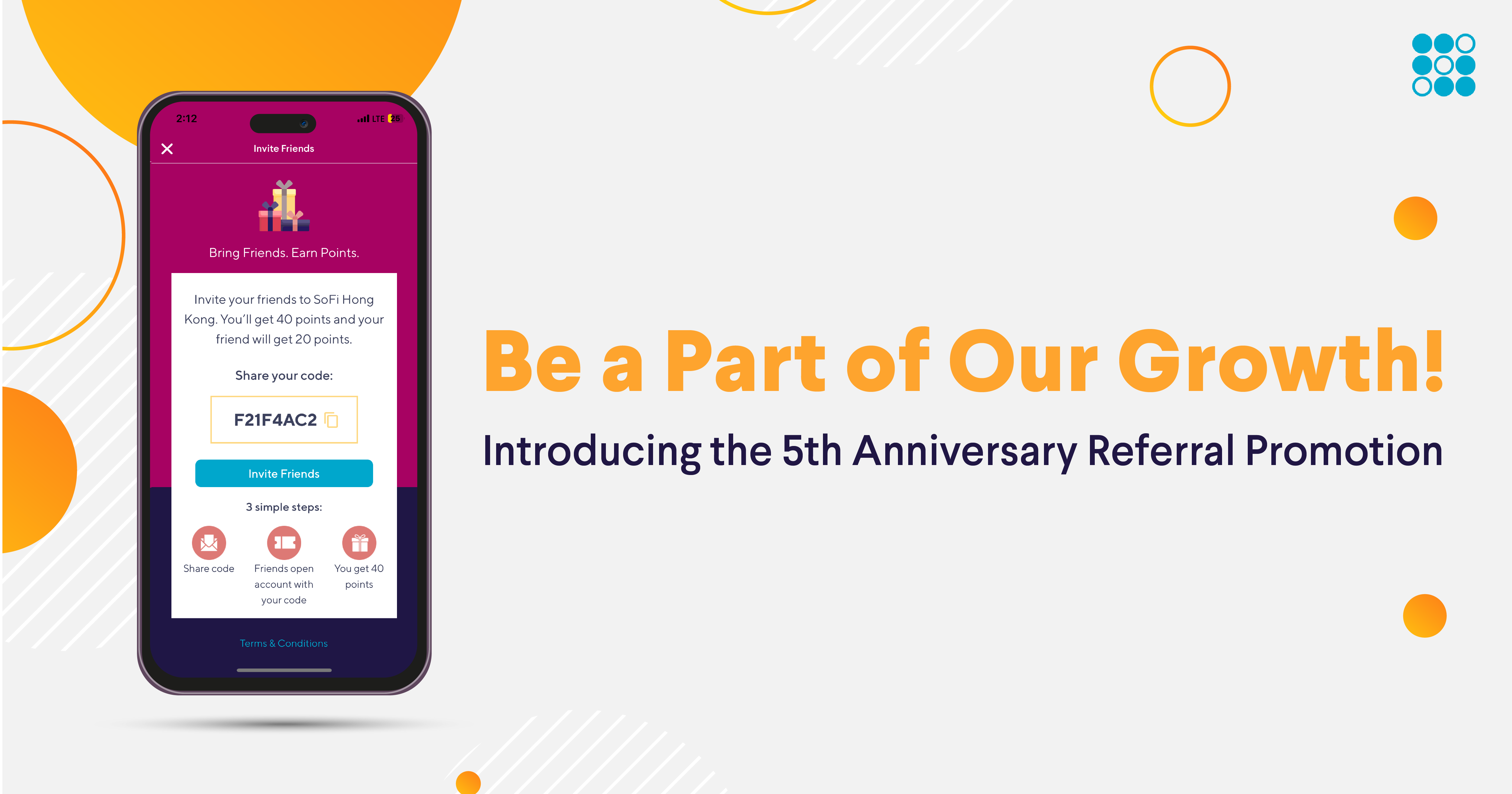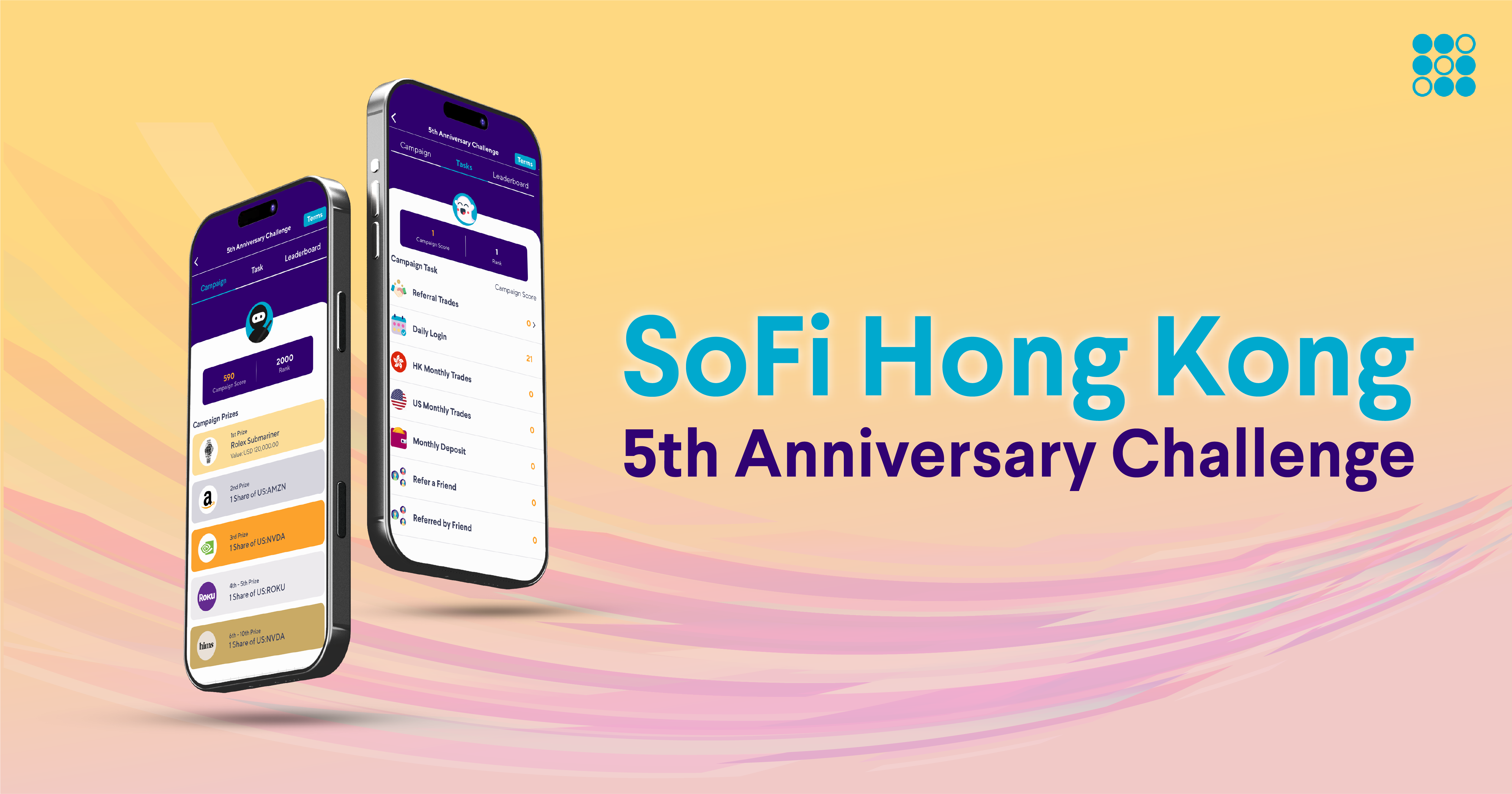 We are thrilled to announce SoFi Hong Kong 5th Anniversary and want to celebrate with you, our amazing members for joining us on this investment journey! To mark this special occasion, we’re launching the SoFi Hong Kong 5th Anniversary Challenge Promotion, alongside the exciting new Auto Invest, raise of HK Monthly Trade SoFi Points rewards and 5th Anniversary Referral Promotion designed to better serve you.