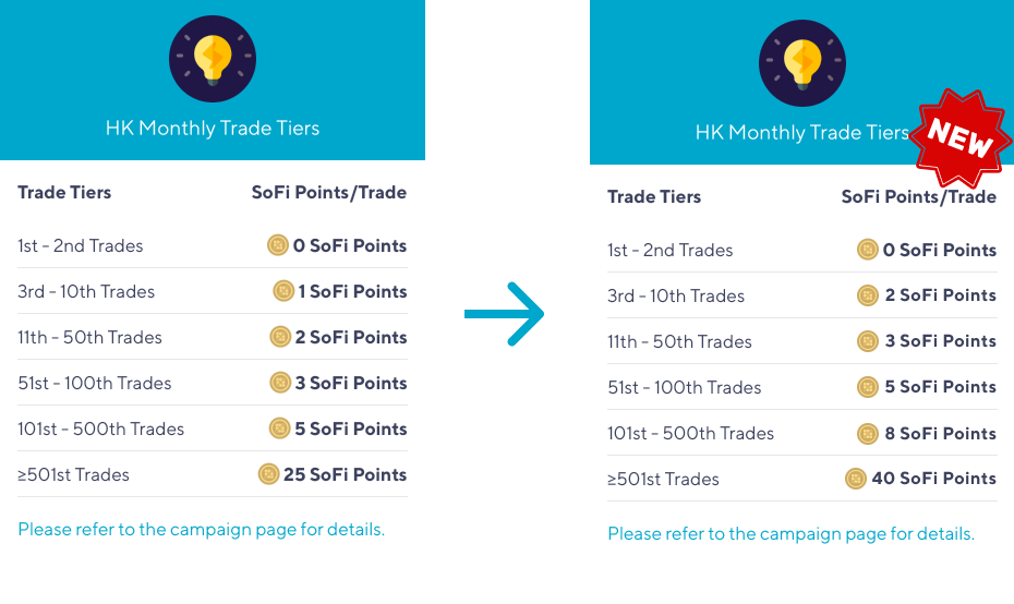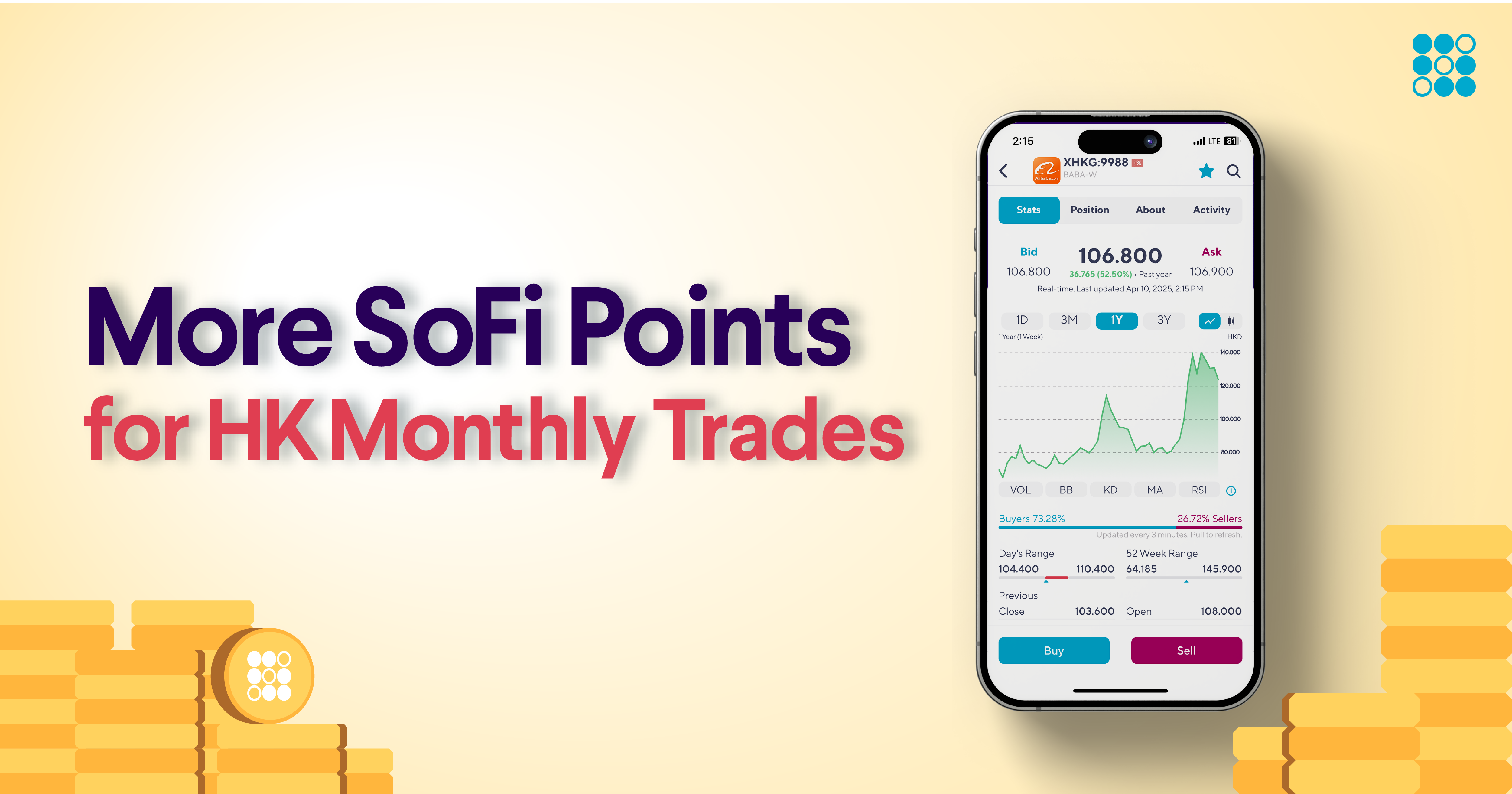 Starting from 1 May 2025, we will raise the SoFi Points you can earn for your monthly HK stock trading activity, meaning that executing more monthly HK trades will unlock even more valuable rewards for you after this update takes effect.