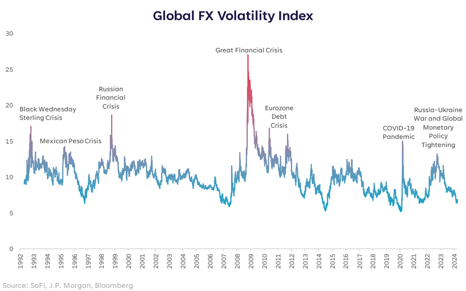 Much like the VIX index that measures volatility in stocks, there is a global foreign exchange (FX) volatility index that measures the swings in major developed and emerging currencies versus the US dollar. Interestingly, a long-term view of this index shows not only that volatility is currently low, but is in the third percentile and appears to be on a steady path downward.