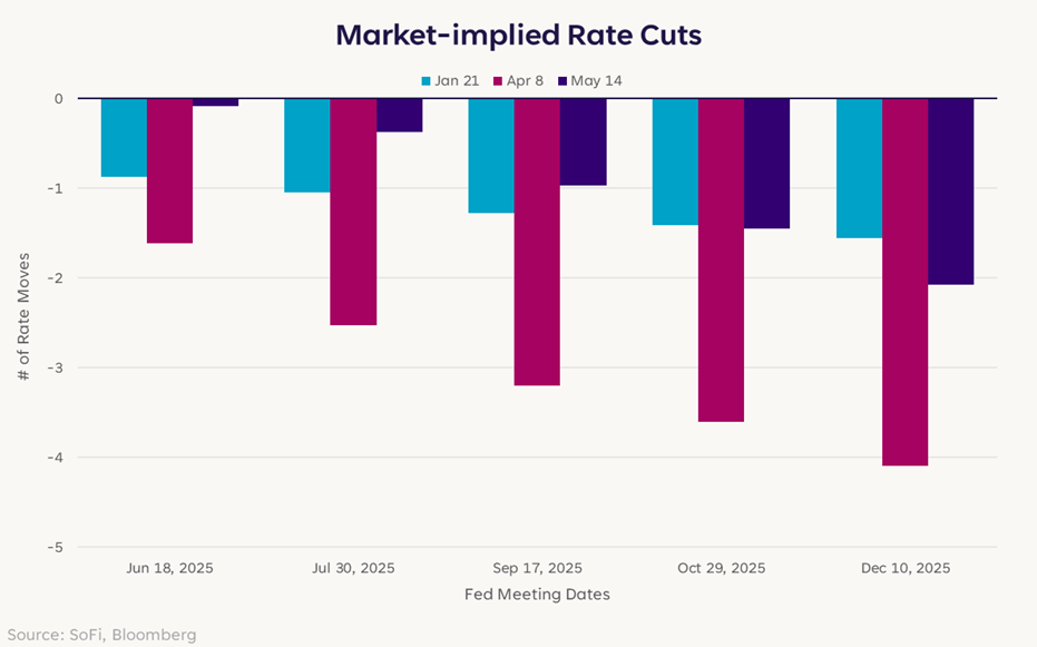 As trade upheaval intensified in March and April, however, recession fears rose. Investors began to anticipate that the Fed would act to support the economy, despite the risk of inflation shocks. Since then, expectations for cuts have eased with year-end expectations now near where they were before all the turmoil.