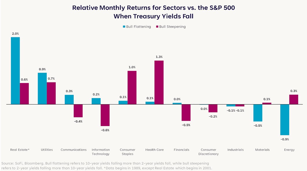 On the other hand, if the economy weakens we could see Treasury yields fall (in other words, a “bull” move for bonds). When Treasury yields are falling (a “bull” market for bonds), the implications for stocks depend significantly on how the yield curve’s shape changes. The two main possibilities here are bull flattening and bull steepening.