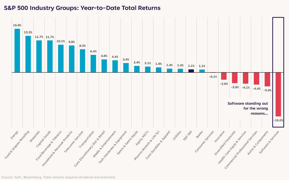 Cyclical sectors have been the primary beneficiary thus far in 2026, occupying three of the top four spots on the year-to-date leaderboard (Consumer Staples, one of our picks for 2026, occupies the other slot). Further down the board, there’s no clear sector pattern.