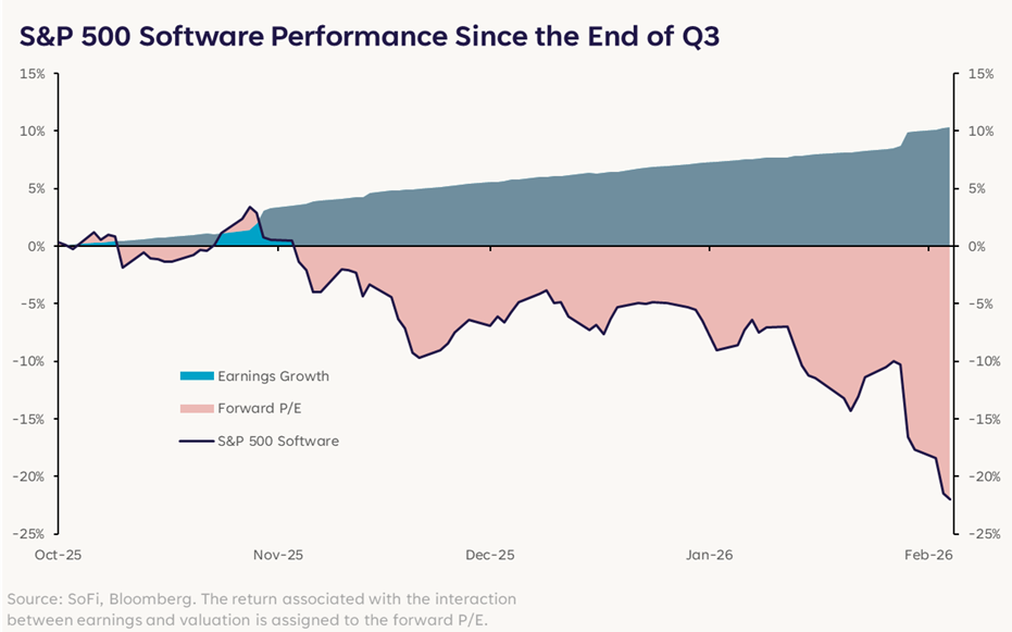 Down 16%, software stocks are underperforming the next worst industry group by a full 11 percentage points. The catalyst? The viral launch of Anthropic’s Claude Code and Cowork tools. Basically, the narrative that has taken hold is that these advanced agentic AI products will democratize coding and intelligence to such an extent that the competitive moats of traditional SaaS (Software as a Service) companies will be eroded. There are even some jitters that the AI agents will replace the companies themselves.