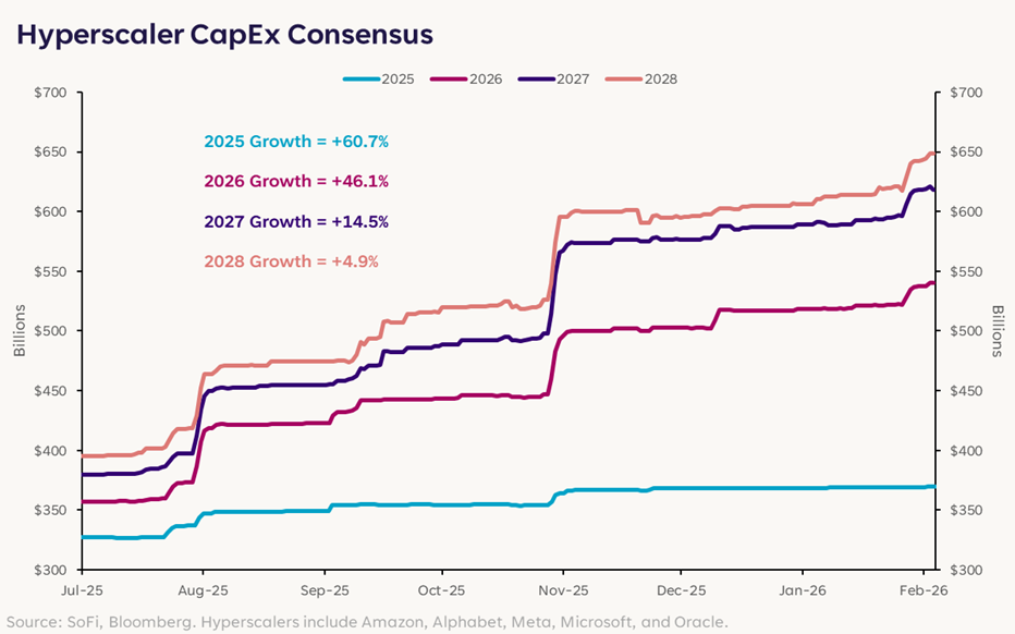 Consensus expectations are for these heavyweights to spend over $540 billion on CapEx in 2026, an increase of 46% from last year’s $370 billion. Those numbers are then expected to rise to $618 billion and $650 billion in 2027 and 2028, respectively. These levels of expenditure are mindblowing, but importantly translate into increased revenue for other companies.