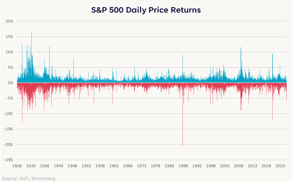 If you were invested in the S&P 500 from 1928 until now, you’d have an annualized price return of 6.0% (i.e. not accounting for dividends or inflation). But if you missed the 10 best days of that period and nothing else, you’d have an annualized price return of 4.8%. In other words, one-fifth of all your gains would have been lost just from missing those days. It’s a tough lesson in discipline, but staying invested is essential.