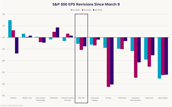 Much has been written about the potential impact of tariffs, but there’s still very little visibility into how trade policy will interact with business uncertainty and retaliation from other countries. There have been some downward revisions to corporate earnings estimates over the last month, but overall they have been quite muted in aggregate and nothing like the 20-30% decline typically seen in recessions.