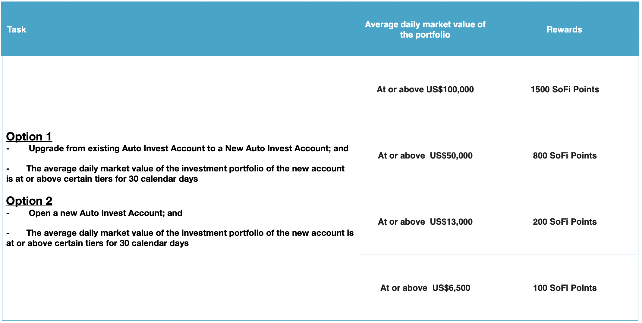 To celebrate this launch, you can earn a tiered SoFi Points rewards of up to 1500 SoFi Points for each upgraded or newly created Auto Invest account holding a total investment portfolio market value at or above a certain amount for 30 days during the promotion period from 2 June 2025 12 a.m. to 1 August 2025 8 a.m..