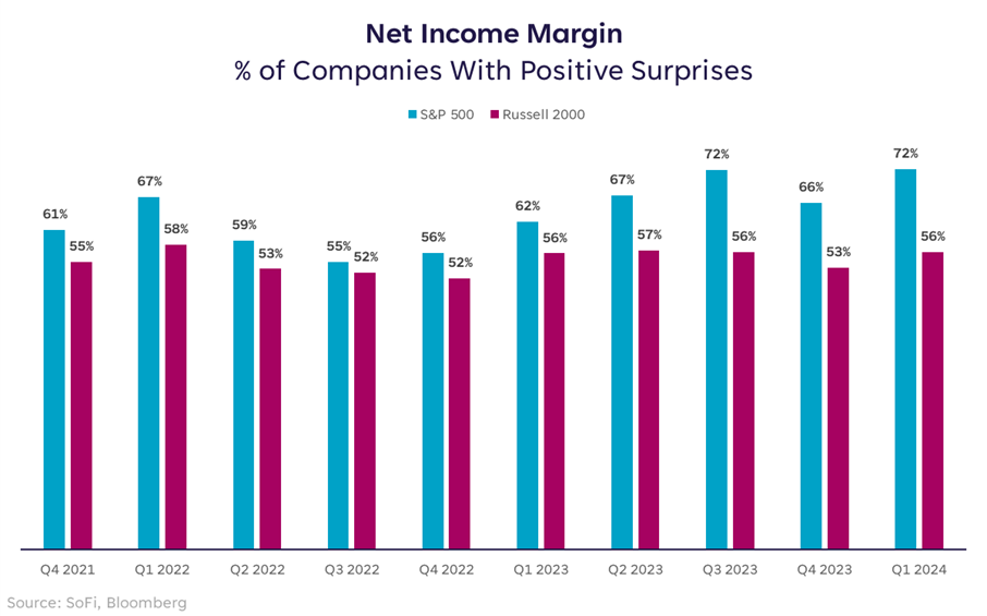The margin story hasn’t been felt equally throughout the market though. While a growing share of S&P 500 companies (i.e. large-caps) have seen their net income margins beat expectations, Russell 2000 companies (i.e. small-caps) have not fared as well.