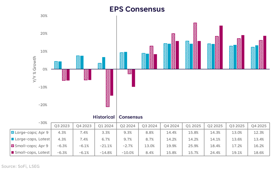 Analysts have taken note of this dynamic, with revisions to the outlook differing for large and small companies despite strong beats from both. Compared to the start of earnings season, growth expectations for larger companies are relatively unchanged. Small-caps, however, are expected to show significantly worse earnings growth over the next four quarters than was expected before companies started reporting.