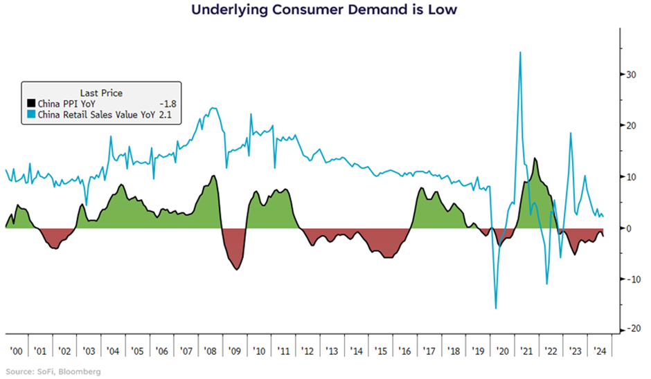All of these efforts are intended to stimulate economic activity, support equity prices, and attempt to give the economy enough of a boost to exit a deflationary spiral that’s been gripping businesses and the property market since fall 2022.