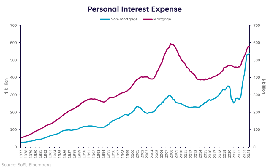 Another aspect that’s important to consider is where the interest expense is going. Given the higher level of rates, we would expect that interest costs on all types of loans have risen, but as we can see in the chart below, the cost of non-mortgage debt has risen substantially more than mortgage debt.