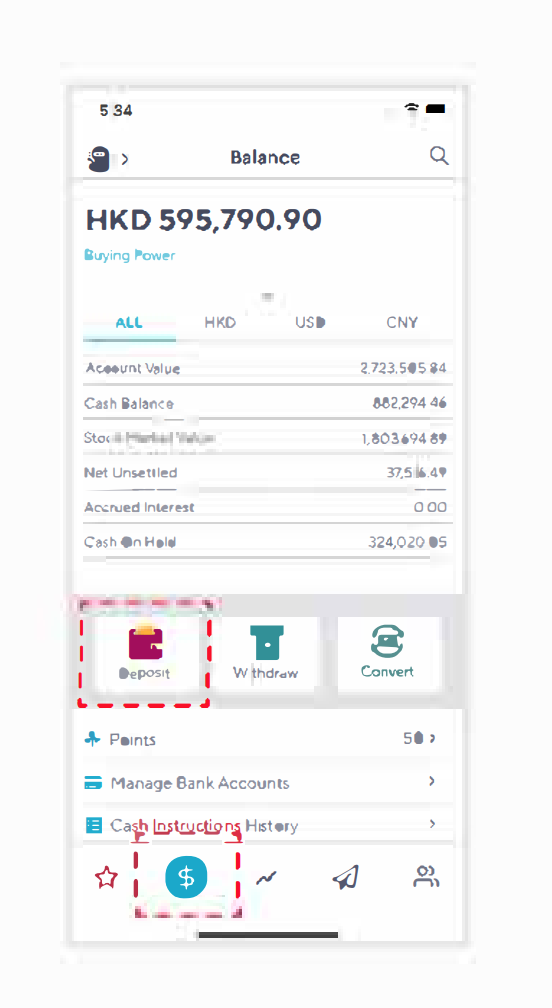‘$’ at the bottom of the main screen >> ‘manage bank accounts’ >> ‘add bank accounts’ >> upload bank proof via instructions; customer should deposit HK$10,000/USD$1300 with the registered bank account from your registered Hong Kong licensed bank account(s) to us for the purpose of identity verification as adding new account will go through applicable anti-money laundering checks.