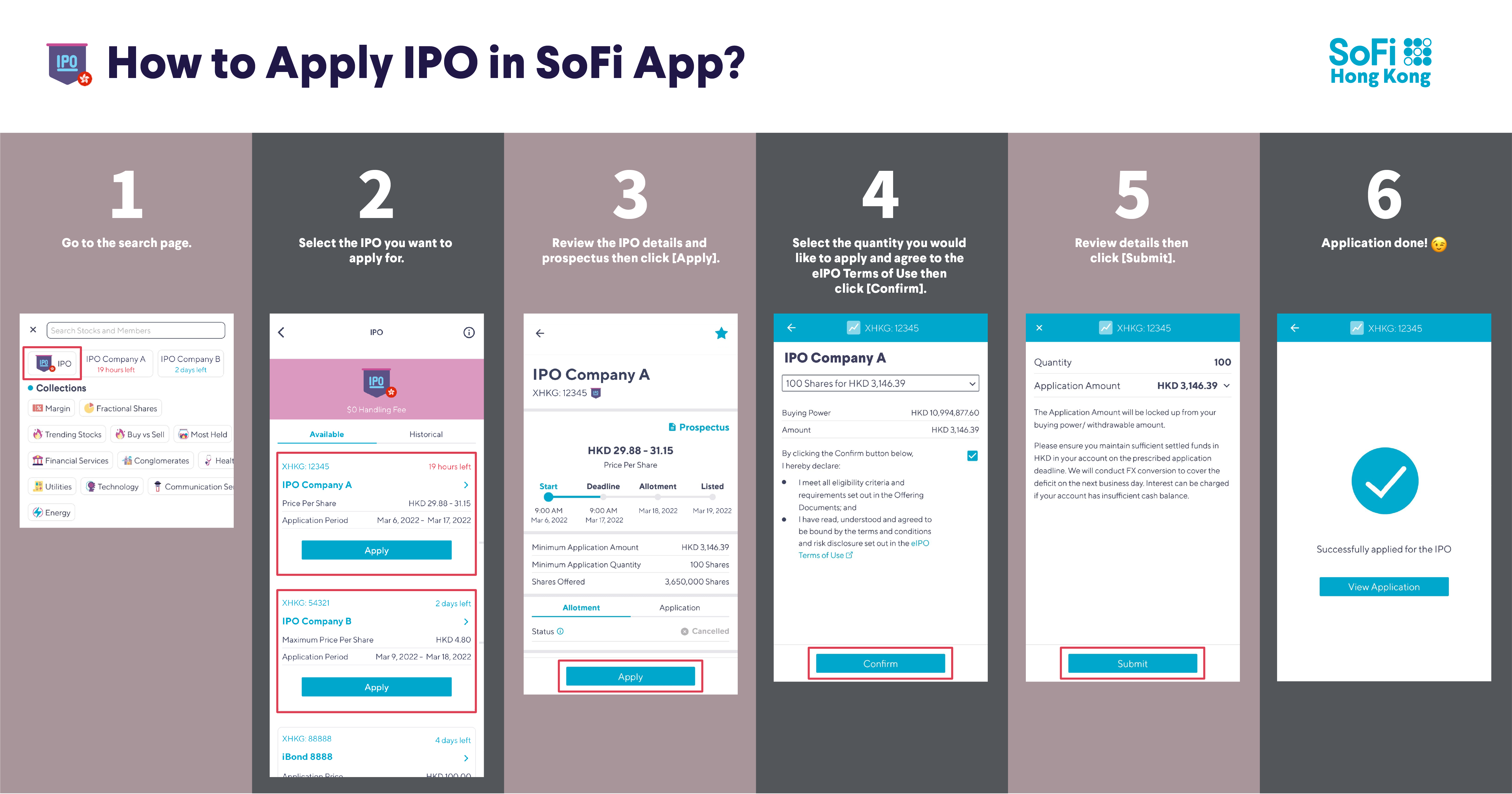 With eIPO you can now make an application to subscribe Hong Kong IPO available on the Hong Kong Main Board and Growth Enterprise Market or Hong Kong Government Bonds with a few simple taps in the SoFi app. You can track your application easily, get updates on whether you were successful or not in receiving the share allotments, and you’ll also be notified through email if you were not successful. And this is all done in the SoFi app. It’s that easy!