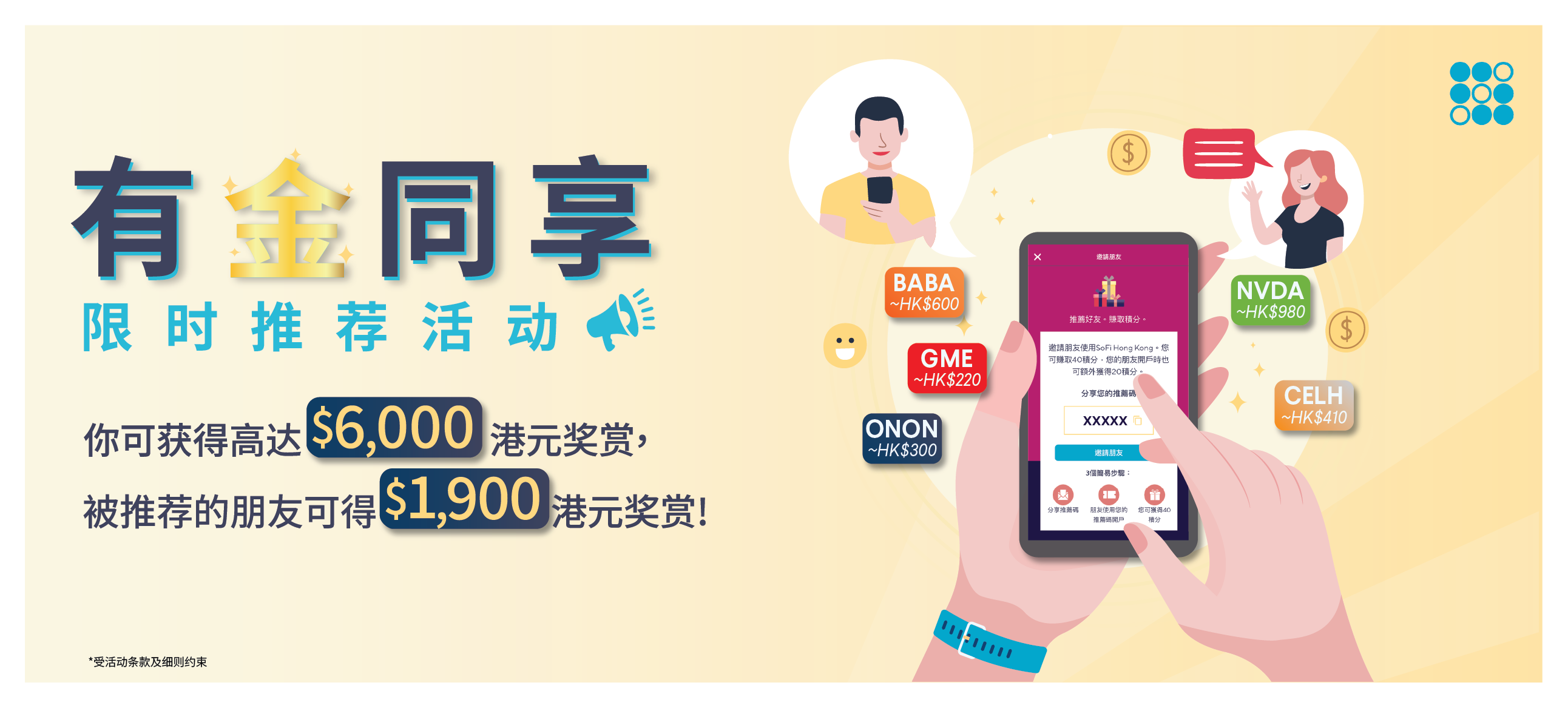 作为 SoFi Hong Kong 的会员,我们希望您一直享受使用我们简单易用而收费相宜的手机应用程序。现在您终于可以将这份喜悦分享给您的亲友。只要成功推荐他们使用 SoFi,双方都可以赚取我们的限时奖赏*。