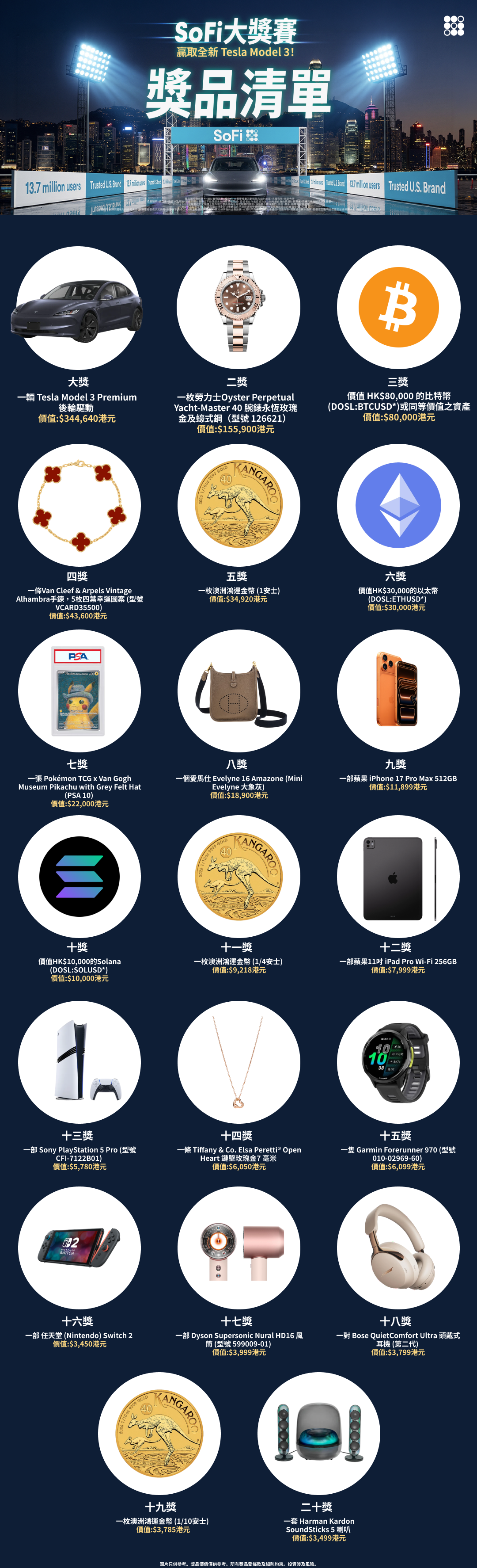 - 免費股票 / 加密貨幣: 將於活動結束後 30 個工作天內,存入得獎者的 SoFi HK 賬戶。