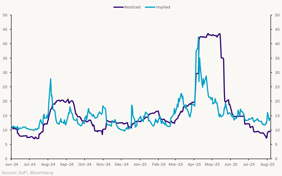 此外,投資者也感到緊張。我們如此說是因為當我們看見從引伸波幅(期權市場對未來30日波幅的預期)與實際波幅(市場真實波動)的對比可見,我們可以看到市場預期的波幅高於我們最近看到的。