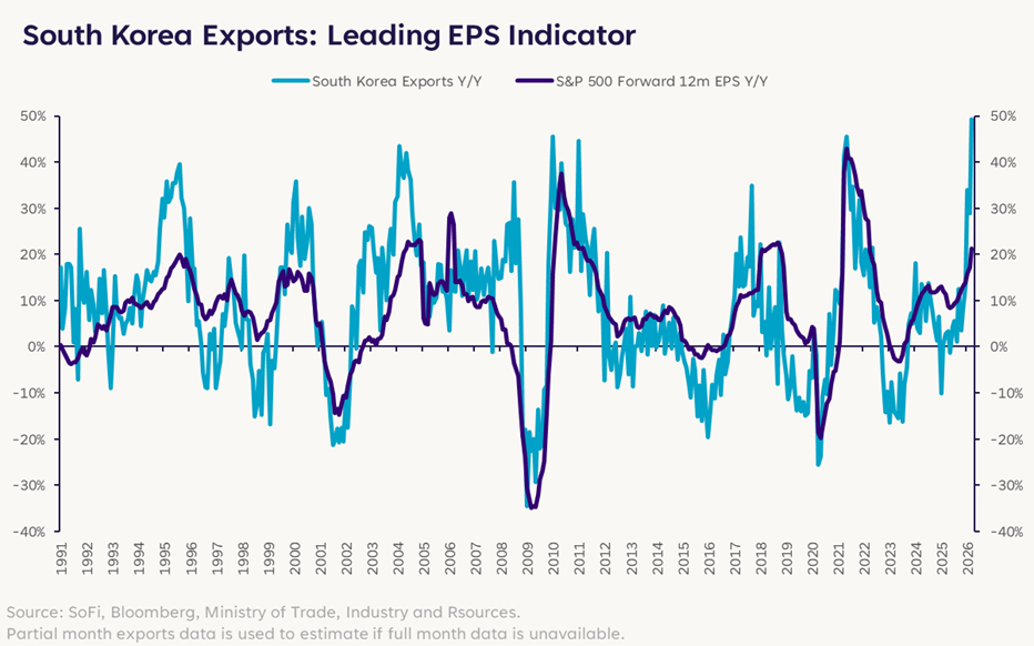 市場上一個有趣的關聯指標,是南韓出口與美國企業前瞻盈利成長之間的關係。具體而言,南韓出口通常領先美國未來盈利成長約一個月,這主要與科技產業的訂單循環有關。南韓是全球最大的記憶體晶片生產國,當出口與訂單增加時,通常意味著科技巨頭正在為更高的需求與營收成長做準備。