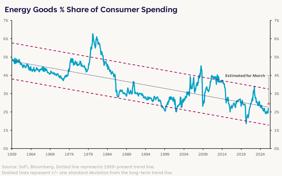 衡量此次油價上漲影響的另一種方法是檢視能源支出在消費者支出中所佔的比例。隨著能源支出佔比的上升,消費者不得不調整消費選擇以抵消價格上漲的影響,他們往往會放棄一些非必需支出,以支付能源等必要開支。令人驚訝的是,近期能源價格的上漲與歷史相比影響甚微,目前尚未敲響警鐘。這意味著在高油價對經濟造成不可挽回的傷害之前,我們還有時間。