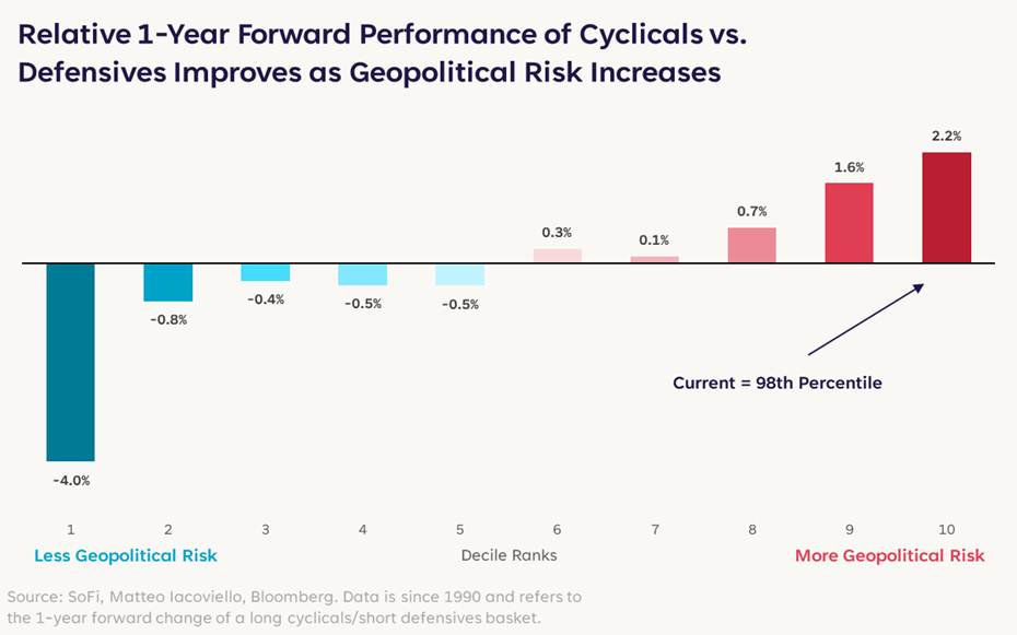 在政治風險飆升後的一年內,週期性股份的表現往往大幅跑贏防禦性股份。換句話說,市場在經歷地緣政治衝突後,情緒反而會變得更加樂觀。這部分可能是源於事件平息後的釋放感,但也可能是因為局勢變得更加明朗,或得到了部分解決。