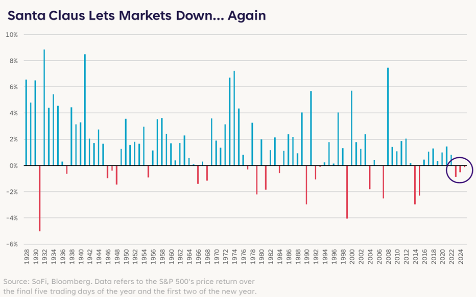 由於投資者期盼的年底升浪並未兌現,最合適的 Tyler 歌詞或許是:「偶爾我會感到一絲緊張,擔心最好的時光已經逝去。」標普 500 指數在傳統上被稱為「聖誕老人升浪 (Santa Claus rally)」的有利時期內下跌了 0.1%,這已是連續第三年出現「聖誕老人暫停 (Santa Pause)」而非升浪。