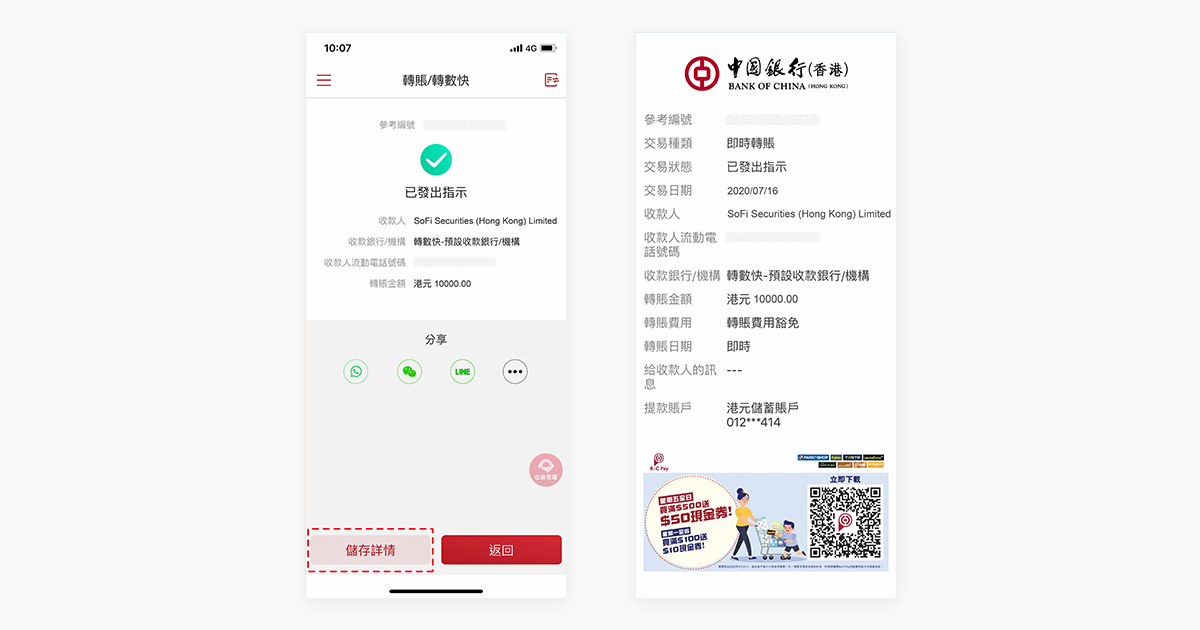 - 不建議經ATM/FPS轉賬,因為收據會隱藏賬戶號碼,經ATM/FPS轉賬需另外提交網上理財交易記錄截圖作為補充文件